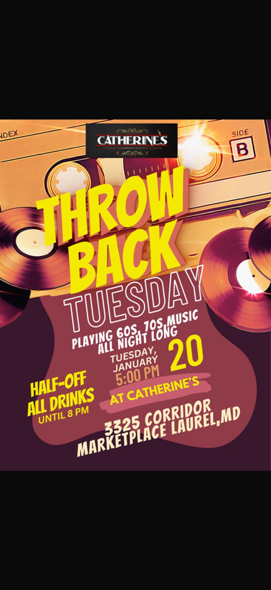 Throwback Tuesday 60’s & 70’s music all night. Half off drinks till 8pm.